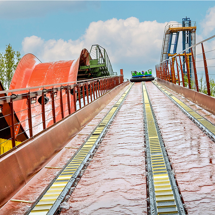 Long de plus de 500 mètres, le parcours emmène ses aventuriers sur un lift menant au haut de la descente puis vous serpenterez un long toboggan entre virages, rotations et éclaboussures !