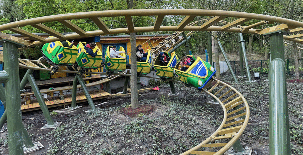 La zone ne se limite pas à une seule attraction. Deux autres installations viennent compléter l’offre pour les plus jeunes. Brazilian Buggies, un petit coaster accessible dès 90 cm, initie les enfants aux sensations de vitesse en toute sécurité.
