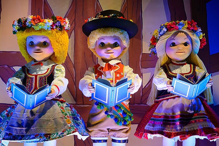celle du Carousel of Progress. Mais voilà qu’un problème surgit sur un autre pavillon, alors baptisé Children of the World. Dans le projet d’origine, des poupées du monde entier étaient censées chanter chacune son hymne national. Mais au lieu de susciter un sentiment d’harmonie, tous ces airs différents joués en même temps créent une véritable cacophonie, imaginez : Toutes ces langues aux multiples sonorités déployant à pleine voix leur partition.