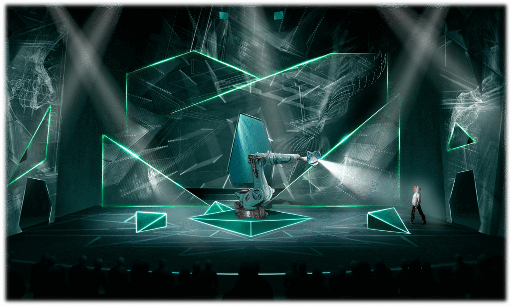 La lumière a une place toute particulière dans Éclipse. Le mapping est complété de structures kinétiques, d’effets LED, rideaux laser et projections reflétées par de multiples miroirs…