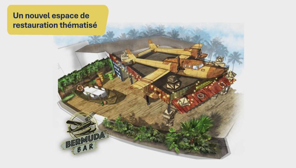 Une zone thématique s’étend autour de l’attraction avec l’ajout d’un restaurant thématisé de type restauration rapide : le Bermuda Bar ainsi qu’une boutique.