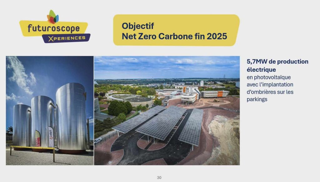 Le Futuroscope vise l’objectif zéro carbone sur les émissions relatives à l’énergie et la chaleur qui devrait-être atteint fin 2025. Tout cela permi grâce notamment à l’implantation d’ombrières sur les parkings et la production de 5,7MW d’électricité photovoltaïque.