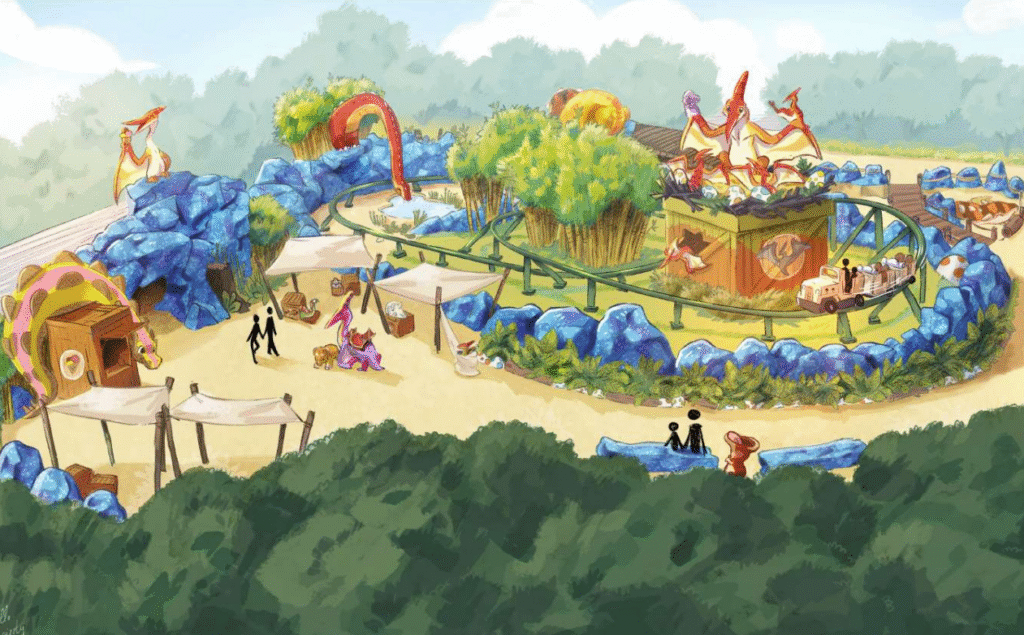 Les concepts art sont des créations de chez AG Imaginering et une partie des décors vient directement de chez NLC Déco. Ici, point de tyrannosaure génétiquement modifié dévorant les visiteurs d’un parc perdu au milieu de l’océan indien, mais plutôt de gentils diplodocus venus pour amuser les tout petits. Une attention toute particulière, notamment au niveau des couleurs, a été apporté aux dinosaures afin de les rendre plus amicaux !