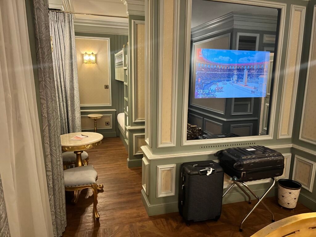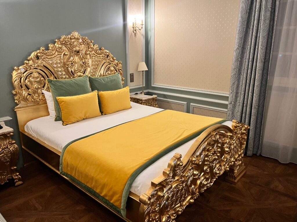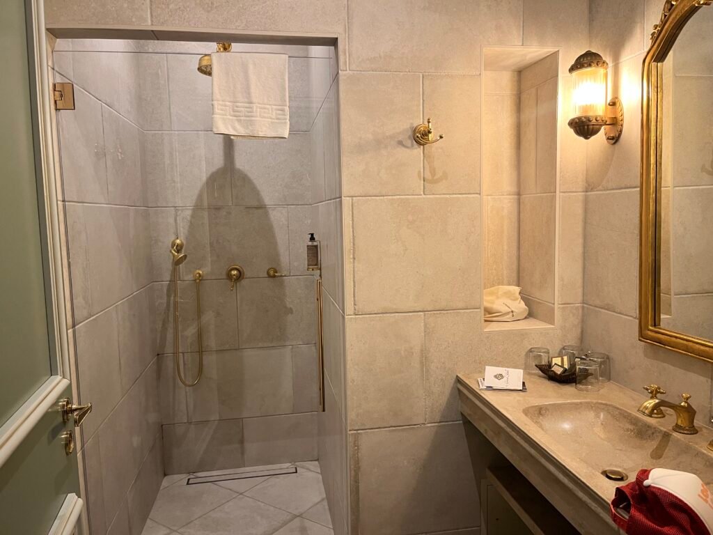 Les sols sont habillés de parquet ancien ou d’imitation marbre selon les pièces, et les lits à baldaquin ou à ciel ouvert évoquent l’architecture intérieure des palais royaux. Les salles de bains, en marbre clair, sont équipées de robinetterie dorée et de douches à l’italienne. Chaque détail, jusqu’à la quincaillerie des portes, contribue à l’immersion dans l’univers du Roi Soleil, tout en offrant la qualité d’un hôtel moderne : climatisation, literie haut de gamme, télévision discrètement intégrée…