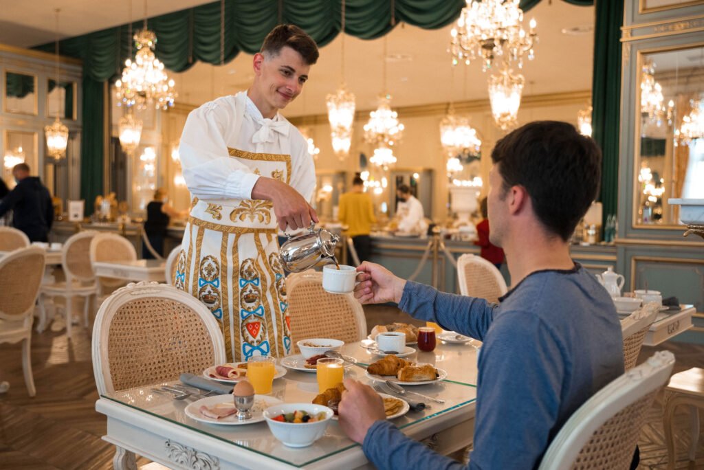 Le buffet de petit déjeuner est de grande qualité, avec un soin particulier à la mise en place de celui-ci, qui rend l’expérience très agréable. L’objectif n’est pas la reconstitution pure, mais une interprétation moderne du banquet royal. Le personnel en tenue d’époque ajoute à l’atmosphère théâtrale sans compromettre l’efficacité du service.