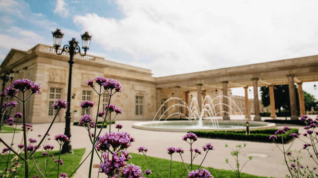 Situé à quelques minutes du parc à pied ou en navette, Le Grand Siècle s’inspire directement du château de Marly, ancienne résidence secondaire de Louis XIV, aujourd’hui disparue. Pensé comme un véritable petit palais royal, l’hôtel se compose de nombreux pavillons symétriques organisés autour d’un jardin à la française de trois hectares, traversé par des allées de gravier blanc, des bosquets taillés au cordeau et des bassins d’agrément. L’architecture évoque le classicisme français, avec ses façades claires, ses toitures d’ardoise, ses colonnades, et ses ferronneries dorées.
