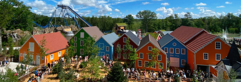 - Février 2024, la réception du splash prend forme, les décors s’installent et la zone scandinave s’agrandit avec de nouveaux bâtiments. La nouvelle attraction entraîne l’arrivée de nouvelles infrastructures comme des toilettes, des boutiques et des points de restauration.