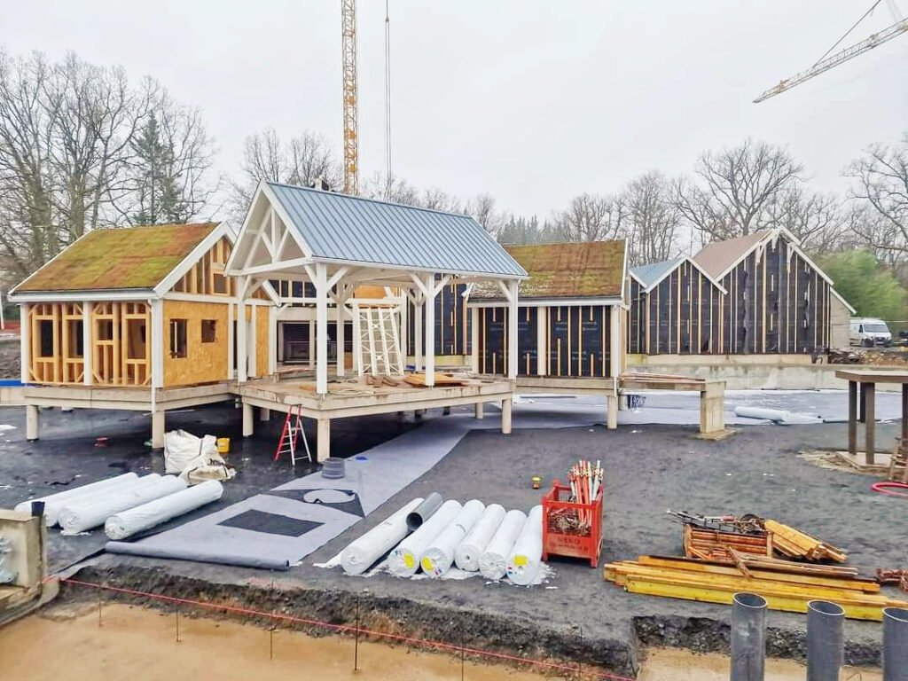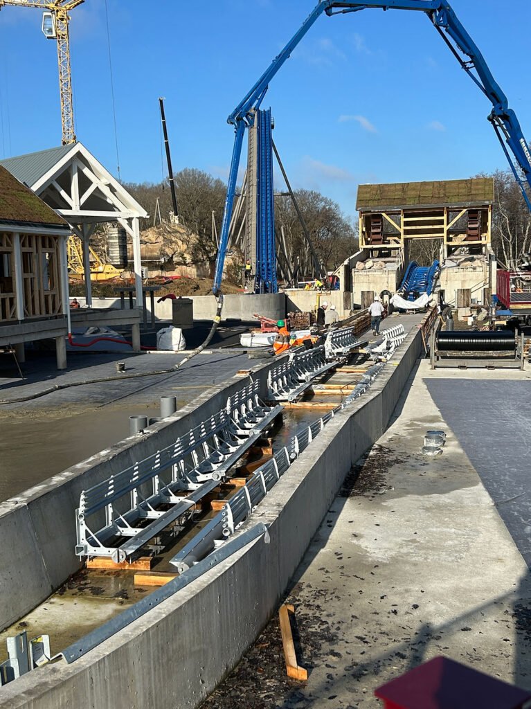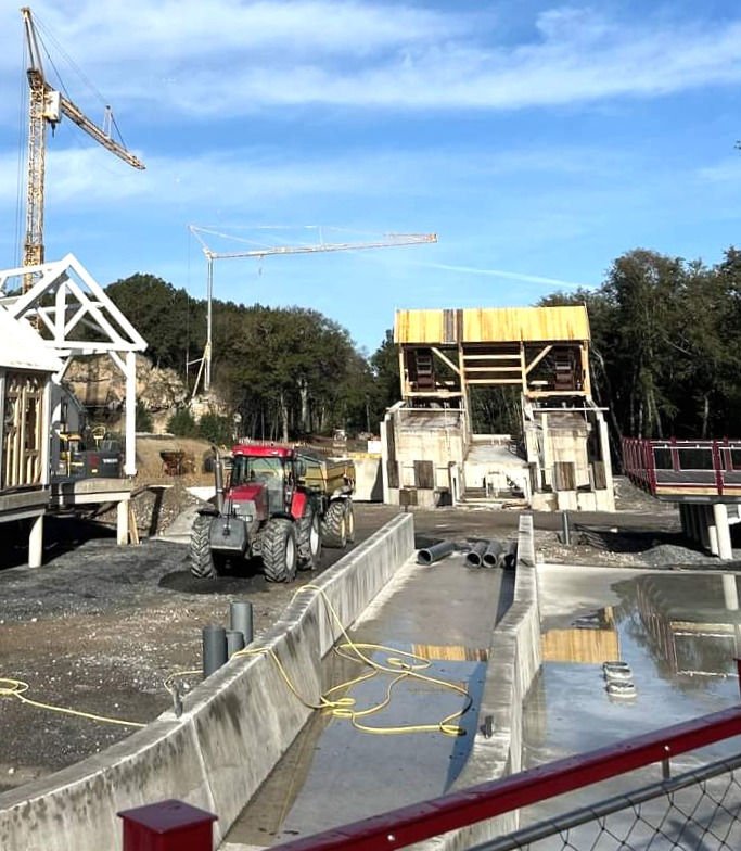- Novembre 2023, les parois et toits de la file d’attente sont installées ainsi que l’édifice qui précède le splash. C’est aussi l’arrivée des poteaux de la structure du roller coaster