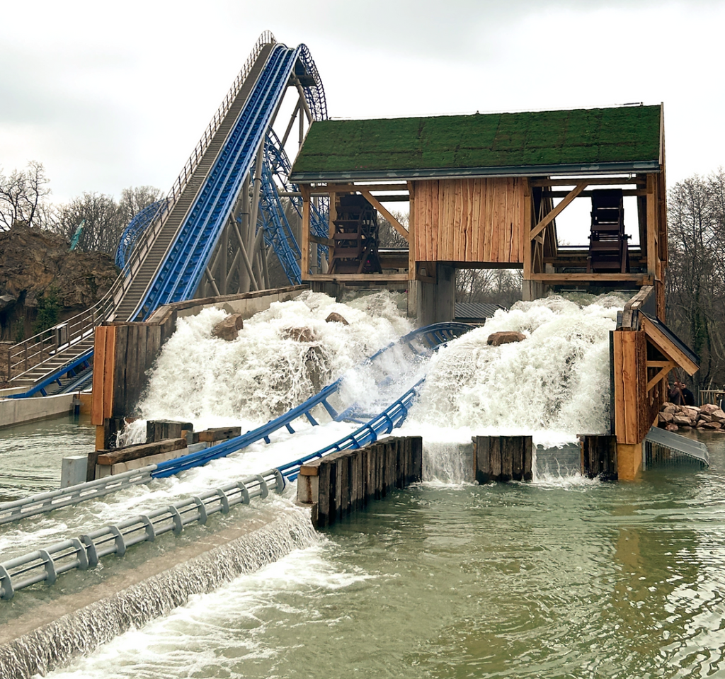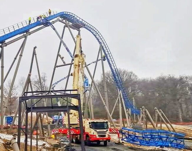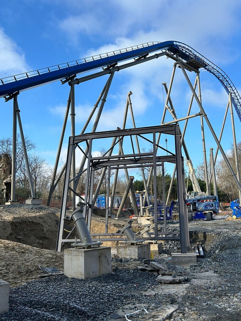 - Janvier 2024, le parc continue l’assemblage du layout avec les supports et les rails accompagnés des infrastructures. La drop de 20 mètres s’annonce prometteuse.