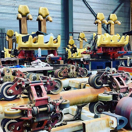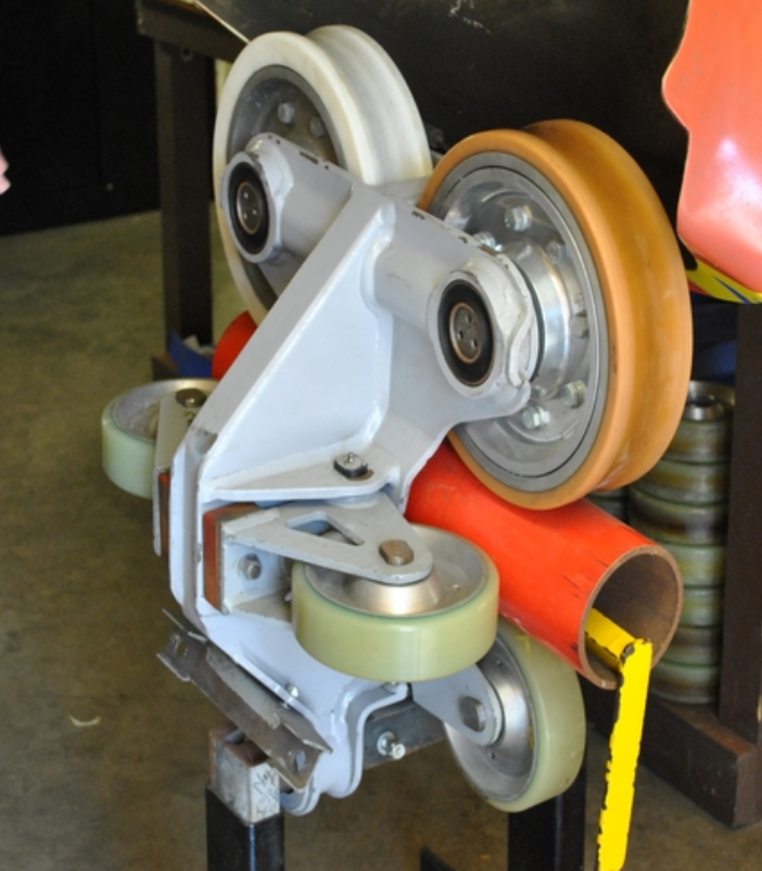 Bogie : Le bogie, appelé aussi « Wheel assembly », est le pièce d’un train de roller coaster sur laquelle sont fixées les roues. Traditionnellement sur les montagnes russes en métal les roues sont placées à 3 endroits. Sur le rail on trouve les roues de tractation ou de roulement, sous le rail ce sont les roues d’arrêt et les roues latérales sont les roues de friction. Le bogie est construit en acier ou en aluminium, les roues sont souvent en aluminium recouvertes de polyuréthane ou nylon. Chacun jour les roues sont contrôlées.