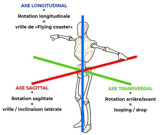 Axe de rotations : La création d’un parcours de montagnes russes passe par une sélection de différentes rotations pour satisfaire les passagers. Tout est fait pour que que notre corps subisse différentes sensations et donc différentes rotations. Voici les 3 rotations que l’on retrouve dans les différents éléments de roller coaster.