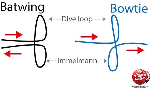 Bowtie : Le « bowtie » est un élément de coaster similaire au « Batwing » à la différence que le train ne fait pas de demi-tour dans le parcours. C’est l’enchainement d’un « dive loop » et d’un « immelman » puis le train poursuit son chemin à l’opposé d’où il est rentré dans la figure. (cette figure n’est plus opérationnelle sur aucun coaster depuis 2024)