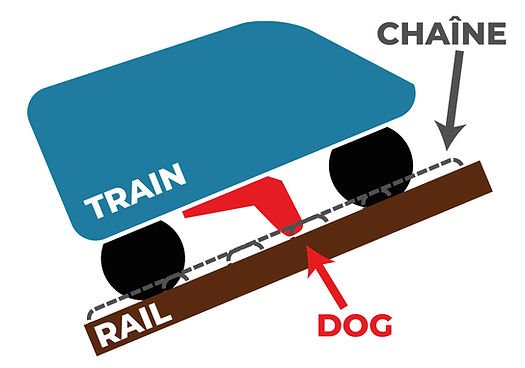 Dog ou Dog chain : Le « dog » ou « chain dog » est une pièce métallique située sous le train, comme un crochet, qui se coince dans la chaîne pour permettre au train de monter au sommet du lift (si c’est un lift à chaîne bien sûr). Cet élément est très solide car un train peut peser jusqu’à 10 tonnes.