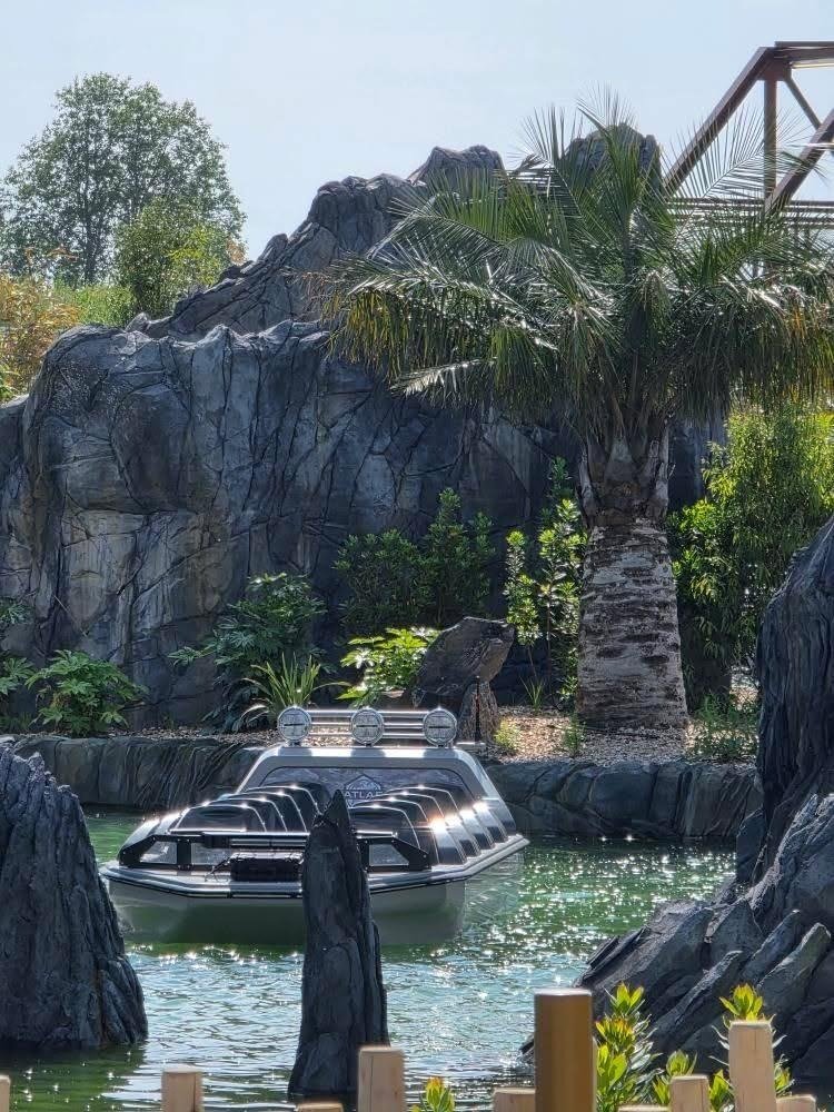 Sous la surface de l’eau, Mission Bermudes repose sur une technologie inédite développée par Mack Rides et dévoilée en première mondiale au Futuroscope. Le Rocking Boat est un système hybride mêlant rail submergé et flottabilité réelle, qui donne l’illusion parfaite d’une navigation libre tout en conservant une maîtrise totale du parcours. L’effet est bluffant : les passagers ont la sensation de flotter à la dérive, alors qu’en réalité, chaque virage, chaque arrêt et chaque montée sont minutieusement orchestrés.