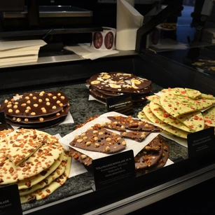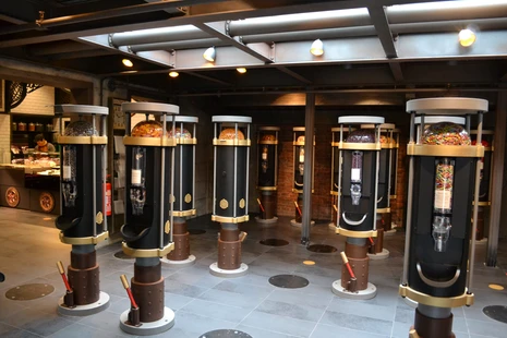 À l’intérieur, des colonnes métalliques remplies de bonbons multicolores permettent à chacun de composer son propre mélange, comme un savant confiseur en quête de la douceur parfaite. Mais le clou du spectacle se trouve au centre de la boutique : une chocolatière, installée dans un atelier vitré, confectionne en direct des plaques de chocolat garnies de fruits secs, de noisettes ou encore de perles croustillantes.
