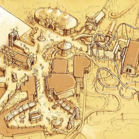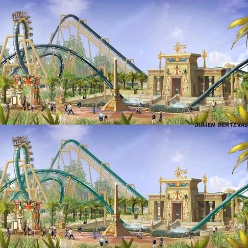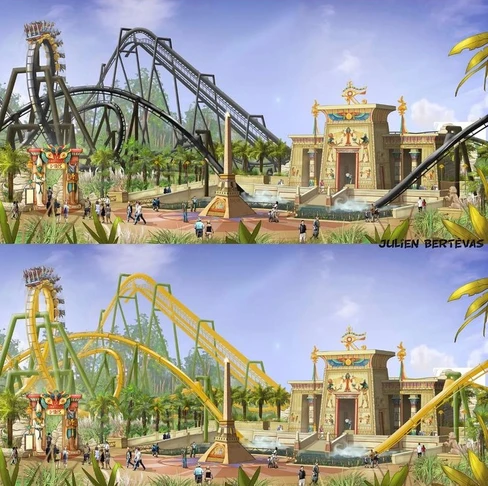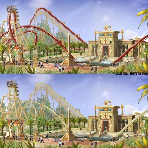 Sur la dernière photo ci-dessus, une idée de ce à quoi aurait pu ressembler la zone Egyptienne, avec une pyramide sur la gauche, des chaises volantes au milieu et un parcours différent de ce que l’on peut connaître aujourd’hui.