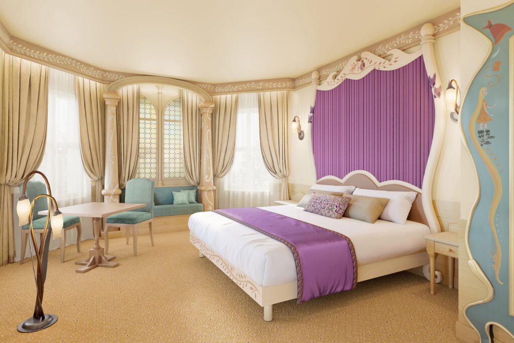 Les suites, quant à elles, montent encore d’un cran : la Suite Signature Aurore évoque les jardins enchantés, celle de Raiponce offre une vue sur les toits du parc, et la Suite Royale inspirée d’Elsa déploie volumes majestueux et ambiance givrée avec une vue imprenable sur le Château de la Belle au Bois Dormant. Chaque espace est pensé pour faire rêver, sans sacrifier le confort ni la modernité.