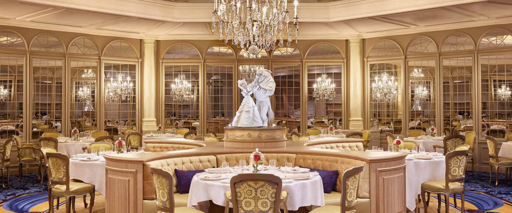 Côté restauration, le Disneyland Hotel change de registre et passe à la vitesse supérieure. Exit le buffet classique : place à deux expériences complémentaires et entièrement repensées. La Table de Lumière propose une cuisine française gastronomique, dans un décor inspiré de la Galerie des Glaces de Versailles mêlé à des références à La Belle et la Bête. La salle centrale, élégante et silencieuse, s’anime à chaque service avec une statue tournante et illuminée du célèbre couple Disney.