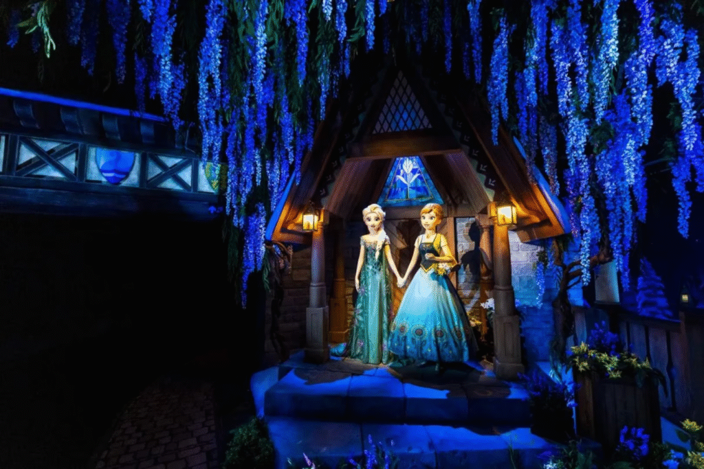 Au loin, la silhouette du North Mountain domine le paysage. La montagne culmine à plus de 30 mètres, recouverte de neiges éternelles. Derrière elle, la musique du film résonne, mêlée à celle d’une foule joyeuse. Contrairement à d’autres lands plus “plats”, Frozen Land propose une réelle verticalité, qui participe à l’illusion de pénétrer dans un monde vivant, autonome, avec ses lois, ses fêtes, son quotidien. Ce n’est pas juste une zone à thème, c’est une destination complète.