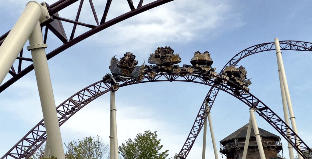 Le circuit débute par une inversion nommée Heartline roll, abordée à très faible vitesse dès la sortie de la gare, cette figure vous retourne près du sol avant de vous remettre en position, comme pour vous dire « ça va secouer ! ».
