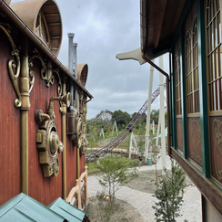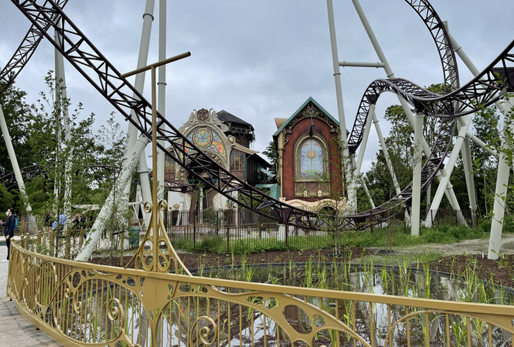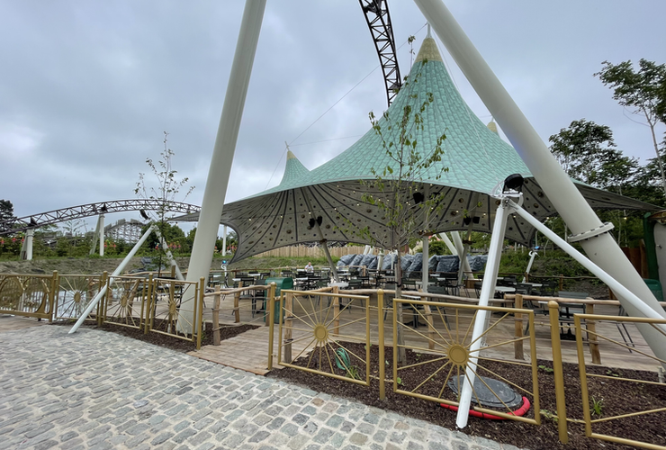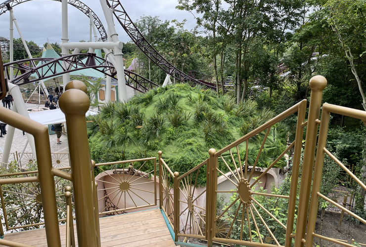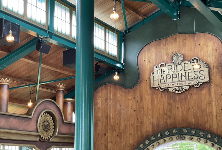 Impossible de parler du coaster sans évoquer premièrement sa thématique. L’attraction est habillée esthétiquement & musicalement par l’univers du très célèbre festival « Tomorrowland« . En passant les portes de cette nouvelle zone, vous découvrirez un monde musical, rappelant incontestablement une clairière de festival avec son échoppe aux allures de maison « Hobbit », son espace de restauration sous une grande toile tendu éclairée et évidemment une gare décorée comme peuvent l’être les grandes scènes du festival de Boom.