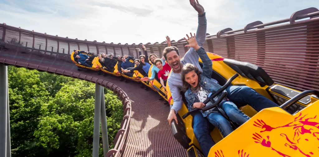 La Trace du Hourra, située en zone Gauloise, est un bobsleigh spectaculaire en 3 étapes : Virage de l’Aurochs, Spirale du Fossile, et Double Défense du Mammouth. C’est l’un des plus hauts et rapides d’Europe dans cette catégorie, idéal pour toute la famille, même les plus jeunes !