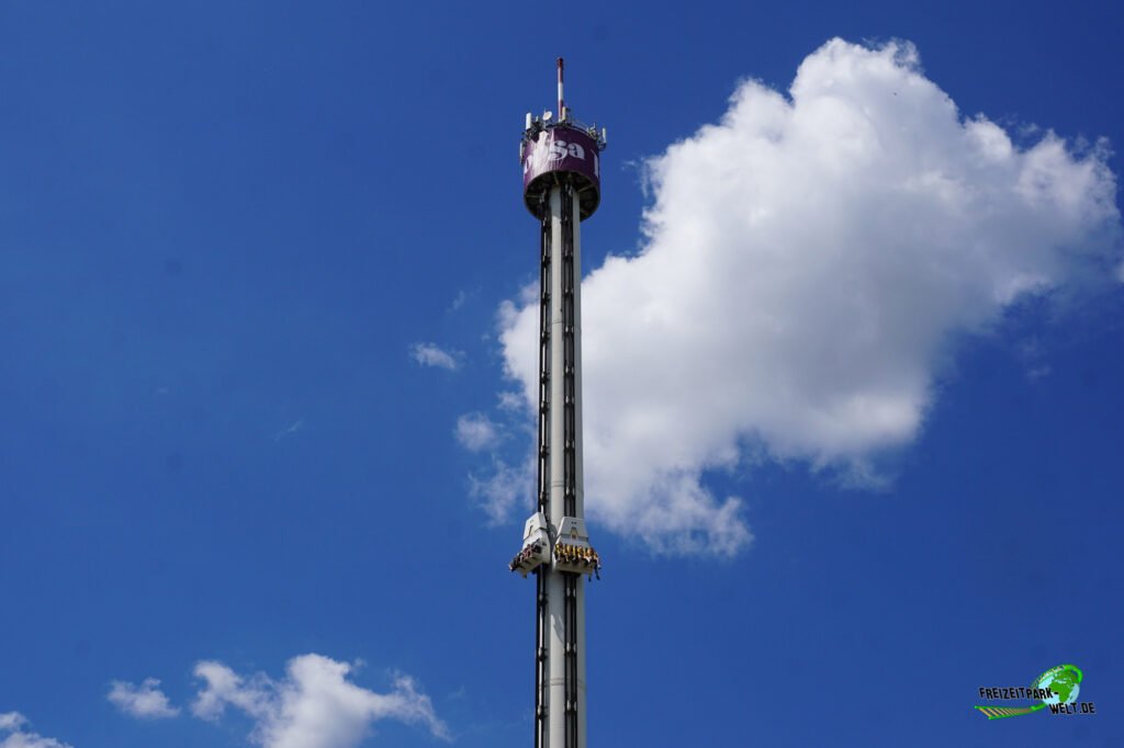 Avec ses 70 mètres de hauteur, cette tour de chute libre est l’une des plus hautes d’Allemagne. Après une montée lente et silencieuse, les visiteurs sont lâchés vers le sol en chute libre, dans une descente vertigineuse de quelques secondes. Adrénaline pure, pour ceux qui aiment le vide sous les pieds.